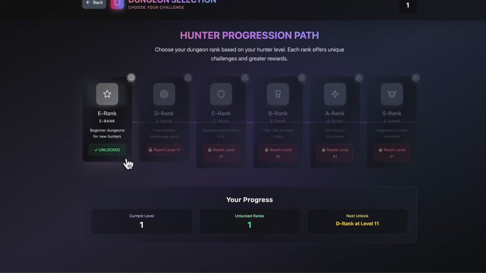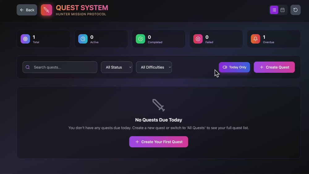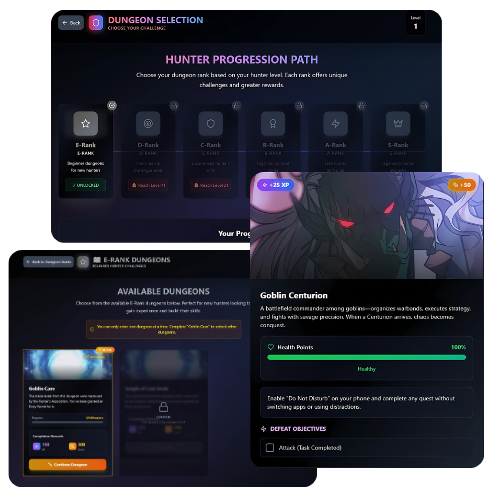 Dungeons, on the other hand, contain pre-designed monsters with set objectives—but those objectives are still tied to your real life. For example, a monster might require you to complete a hard-difficulty quest from your own Quest Builder to deal damage. So while the monsters are fixed, how you fight them is always based on your own effort and consistency.