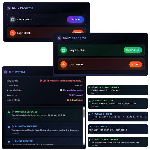 Gamify includes a daily check-in system that tracks your consistency. Every day you show up and press the check-in button, your streak continues—and the longer your streak, the higher your XP and Gold multipliers grow. These bonuses apply to both quests and dungeon clears, rewarding you for showing up consistently over time.